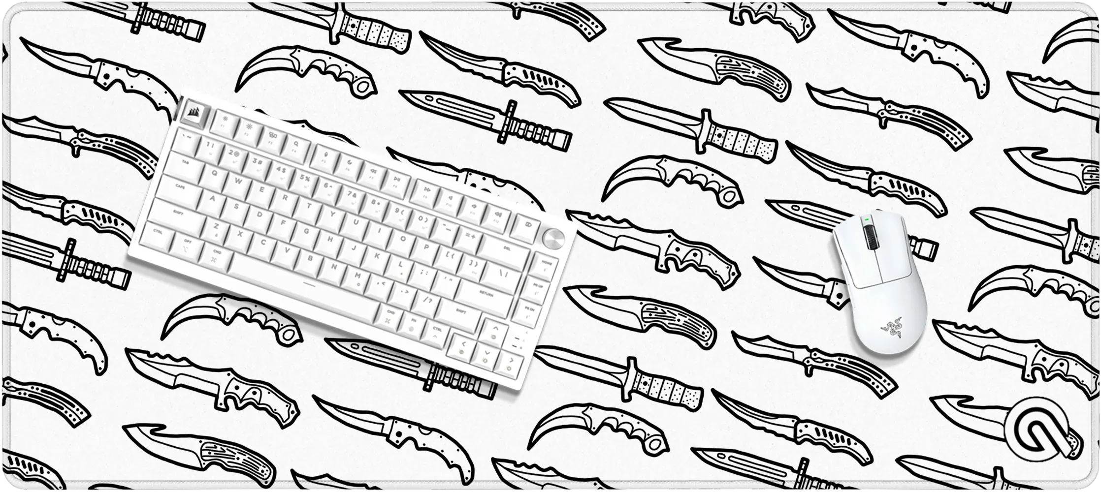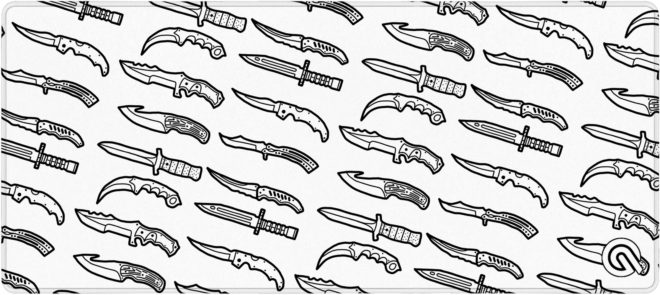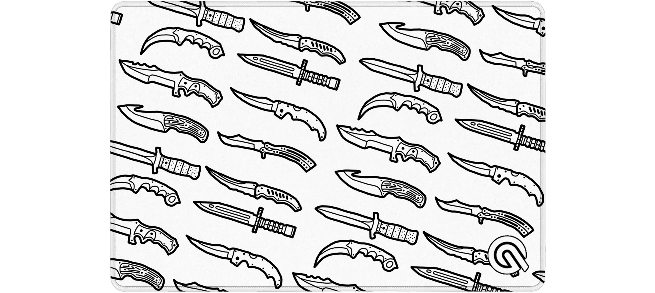 Un motivo expresivo, en blanco y negro, para jugadores a los que les gustan los contrastes fuertes. El patrón del arma sobre un fondo negro crea un acento potente, ideal para puestos con RGB o temas de colores oscuros.
